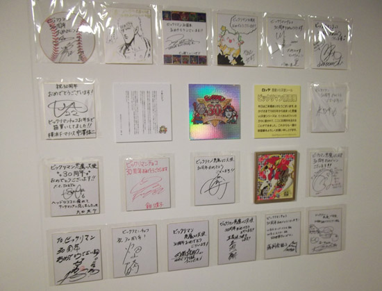 少しずつ動き出すビックリマンファンの列。脇に置いてあるガチャガチャに目移りしながら前へ前へと移動していきます。途中の壁に著名人からのサインが飾られていました。